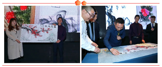 美女帥哥主持已經(jīng)是非常的養(yǎng)眼,優(yōu)美動聽的歌曲讓會場變得非常的溫馨。當然最激動的還是現(xiàn)場作畫及競拍環(huán)節(jié),這幅由公司生產(chǎn)部員工姚玉磊現(xiàn)場創(chuàng)作,并蓋上了李軍董事長印章的《梅笑迎春》作品, 最后拍出了58000元。
