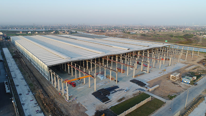 2018年4月15日,對于錦蕭建筑科技有限公司來說,是個特別的日子。一年前,嘉興市海鹽元通工業(yè)園區(qū)這里的一片230多畝地還是荒蕪的黃土地,一年后的今天,一座嶄新宏偉的PC構(gòu)件生產(chǎn)基地拔地而起。在這短短的一年時間內(nèi),9萬多平方米的巨形廠房已建成,10個生產(chǎn)車間、600多個固定模臺、智能化生產(chǎn)線等主體設(shè)備已經(jīng)進(jìn)入安裝調(diào)試與試生產(chǎn)階段,專用碼頭主體結(jié)構(gòu)已成形,預(yù)計5月底這個單體生產(chǎn)年產(chǎn)量最大的預(yù)制裝配式構(gòu)件生產(chǎn)基地將全面投產(chǎn)。