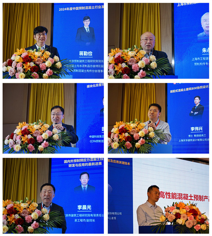 隨后的專家報告環(huán)節(jié),中國混凝土與水泥制品協(xié)會特別副會長、預(yù)制混凝土構(gòu)件分會理事長、北京預(yù)制建筑工程研究院院長蔣勤儉,上海市工程建設(shè)質(zhì)量管理協(xié)會預(yù)制構(gòu)件專業(yè)委員會主任朱永明,中建科技集團(tuán)有限公司副總工程師、中國混凝土與水泥制品協(xié)會預(yù)制混凝土構(gòu)件分會秘書長田春雨,上海天華建筑設(shè)計有限公司總工程師李偉興,北京市建筑工程研究院有限責(zé)任公司總工程師、副院長李晨光,上海建工建材科技集團(tuán)有限公司副總工程師、技術(shù)中心主任朱敏濤,分別作《2024年度中國預(yù)制混凝土行業(yè)發(fā)展報告》、《上海預(yù)制混凝土構(gòu)件行業(yè)創(chuàng)新與發(fā)展探索》、《模塊化房屋技術(shù)體系與工程應(yīng)用》、《裝配式混凝土建筑BIM協(xié)同設(shè)計及案例分析》、《國內(nèi)外預(yù)制預(yù)應(yīng)力混凝土技術(shù)研發(fā)與應(yīng)用的最新進(jìn)展》、《高性能混凝土預(yù)制產(chǎn)品開發(fā)及應(yīng)用關(guān)鍵技術(shù)》的報告分享。